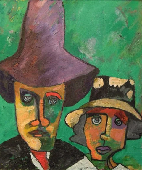 I visit galleries and sketch portraits. The Reapers, the original of which is entitled Return of the Reapers is a full length image of two French agricultural workers painted in 1886 by Herbert la Thangue. It is in the Royal Academy. I concentrated on their faces and developed them into something more modern. Sometimes I take an image from a tv show and sketch that and then interpret it on canvas in my own style. Mr Jelly 1 and 2 are taken from the BBC 2 series Psychoville.